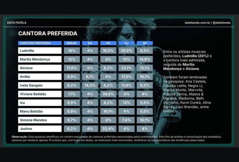 Não é à toa que Ludmilla é dona do hit “Rainha da Favela”, né? Uma pesquisa divulgada pelo Data Favela mostrou que a cantora é favorita nas favelas brasileiras, alcançando mais de vinte por cento da preferência geral.
